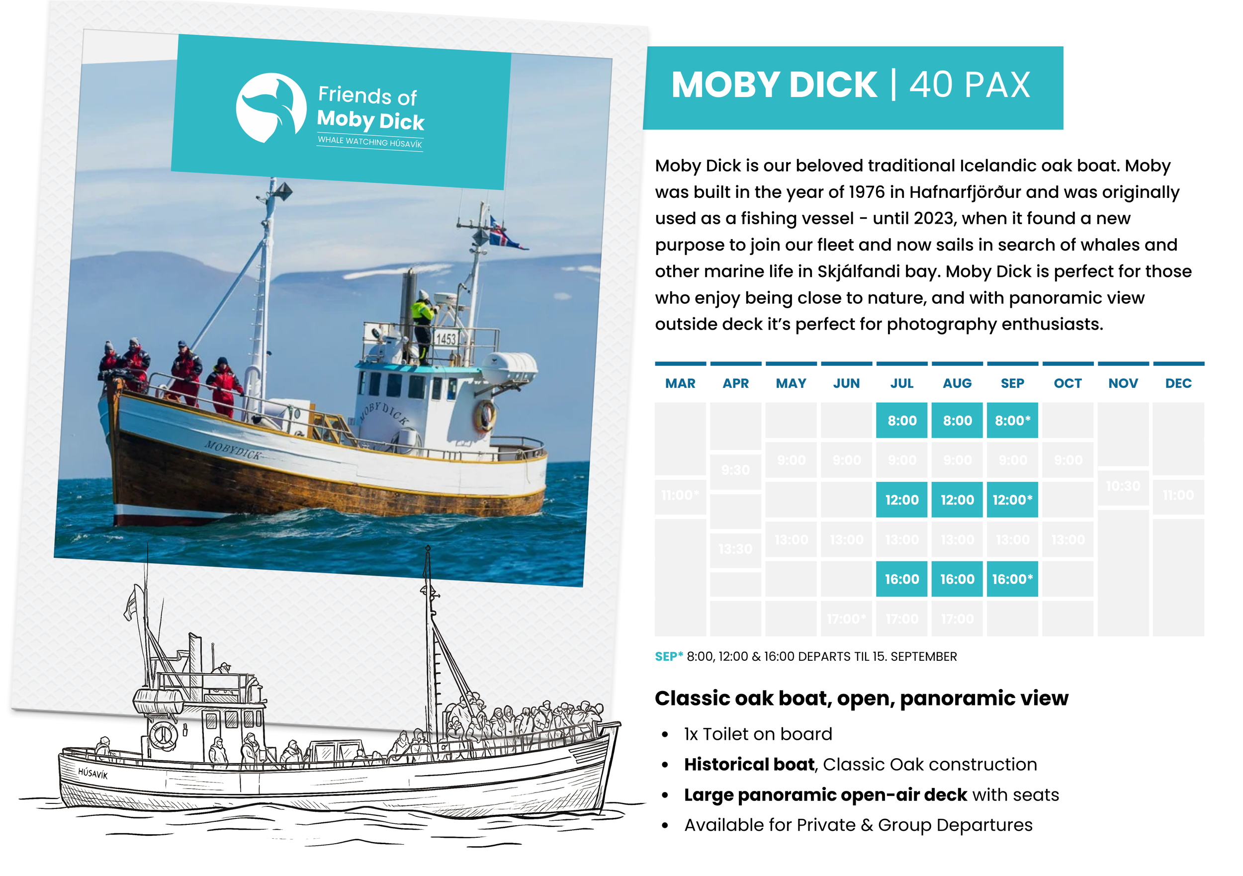 Since 2023, in the pristine waters of Skjálfandi Bay, the new „Moby Dick” is out at sea and we offer daily tours departing from Húsavík Harbour.