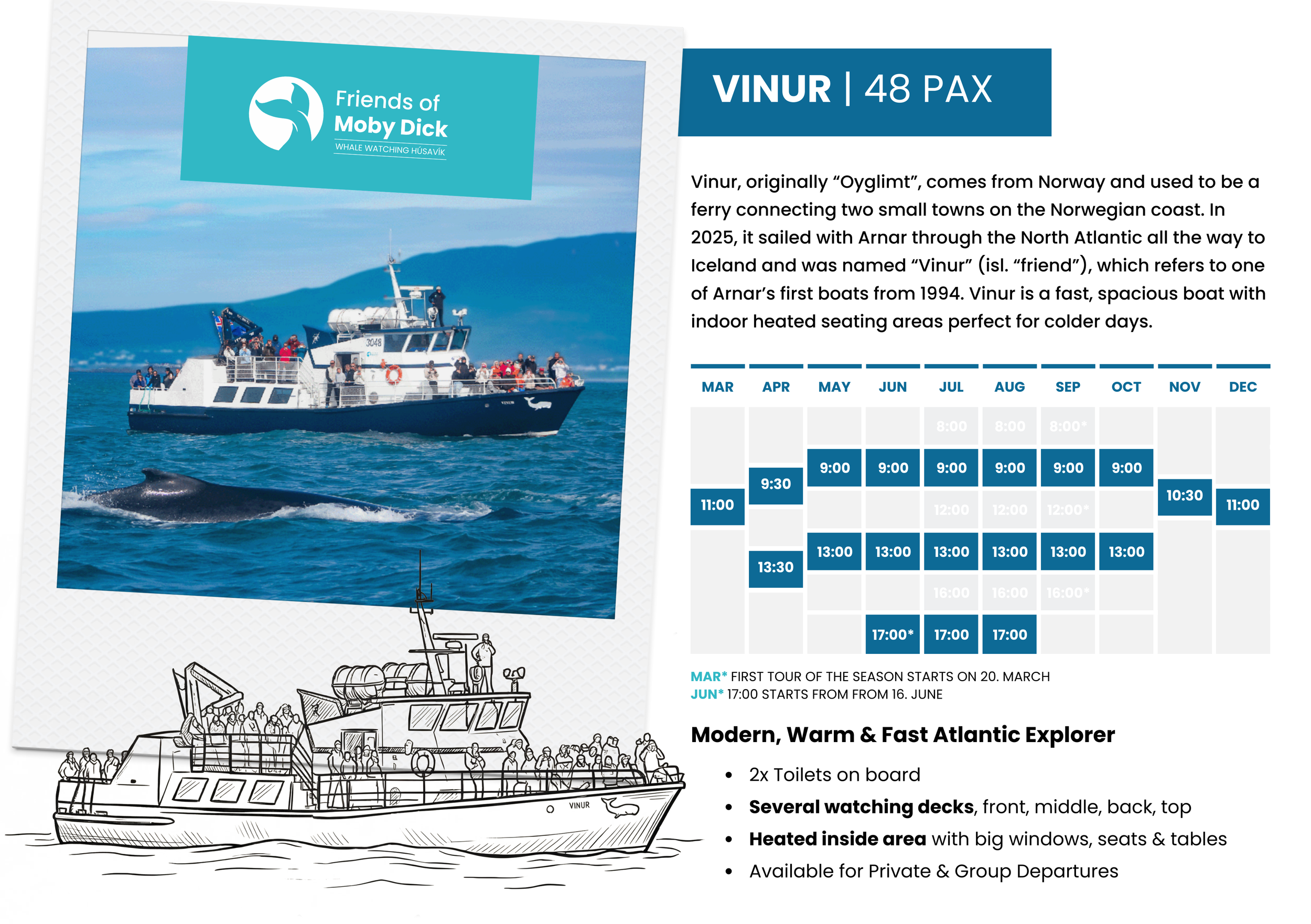 We are always happy to welcome groups on board and are open to collaborating with agencies. We operate our tours on a regular daily schedule aboard our famous boat, Moby Dick, and our newly added modern boat, Vinur.